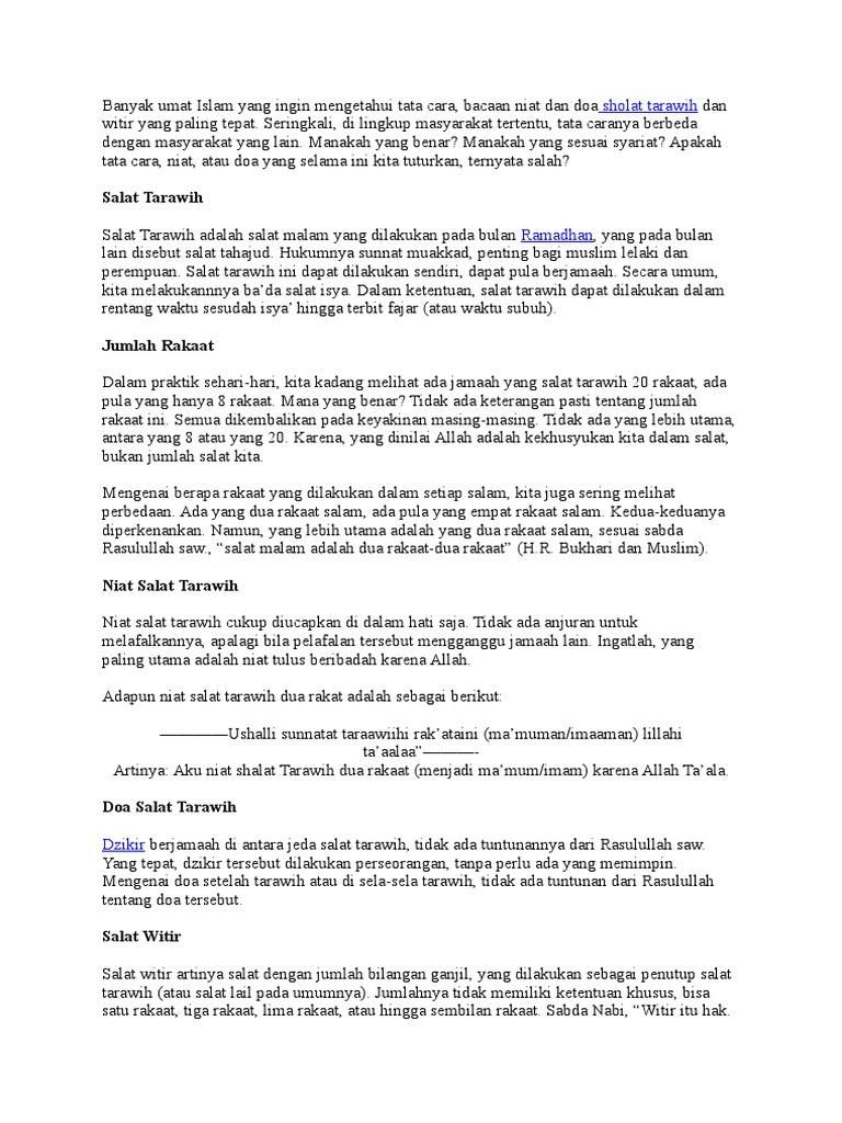 Bacaan niat sholat tarawih sendiri, berjemaah, berikut niat sholat witir. Terkait niat sholat witir berjemaah, terdapat perbedaan antara bacaan niat sebagai makmum dan imam. Sholat sunnah tarawih atau kadang sering disebut dengan teraweh/taraweh ini merupakan shalat yang dikerjakan dimalam hari setelah melakukan salat isya adapun lafadz bacaan niat tata cara shalat tarawih dan sholat witir dapat anda lihat dibawah ini yang lengkap dalam tulisan arab maupun latin. Sholat tarawih adalah ibadah sunnah yang hukumnya sunnah muakkad. Asyhadu alla ilaha illa allah (aku bersaksi bahwa tiada tuhan yang disembah melainkan allah).